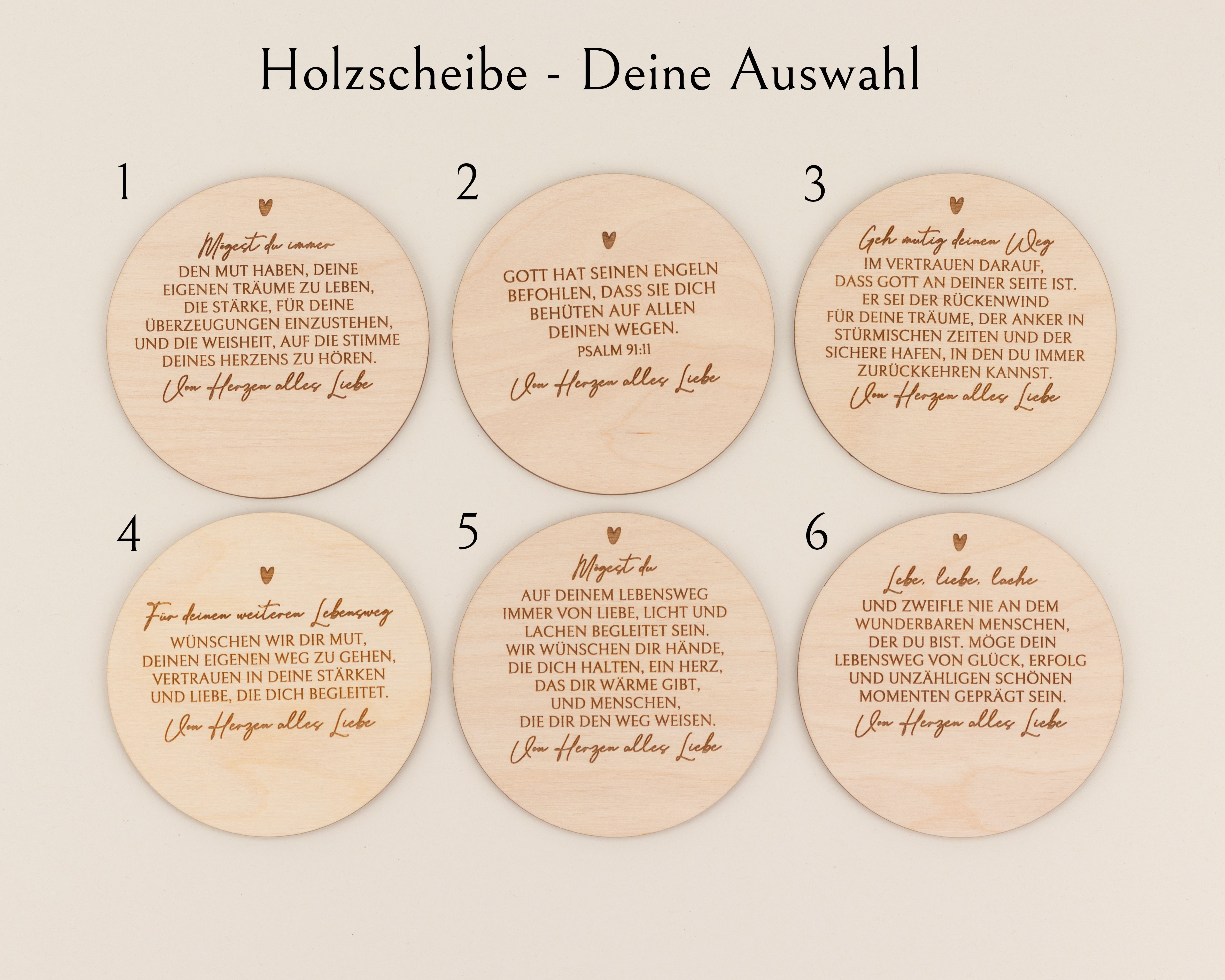 Mach die Box zu deinem ganz persönlichen Geschenk: Gib den Namen des Kindes an und wähle einen von sechs wunderschönen Sprüchen für die gravierte Holzscheibe. Optional kannst du das Datum der Firmung ergänzen, eine persönliche Widmung auf der Holzscheibe hinzufügen oder das Geschenk mit einem passenden Anhänger an einer Kordel abrunden.