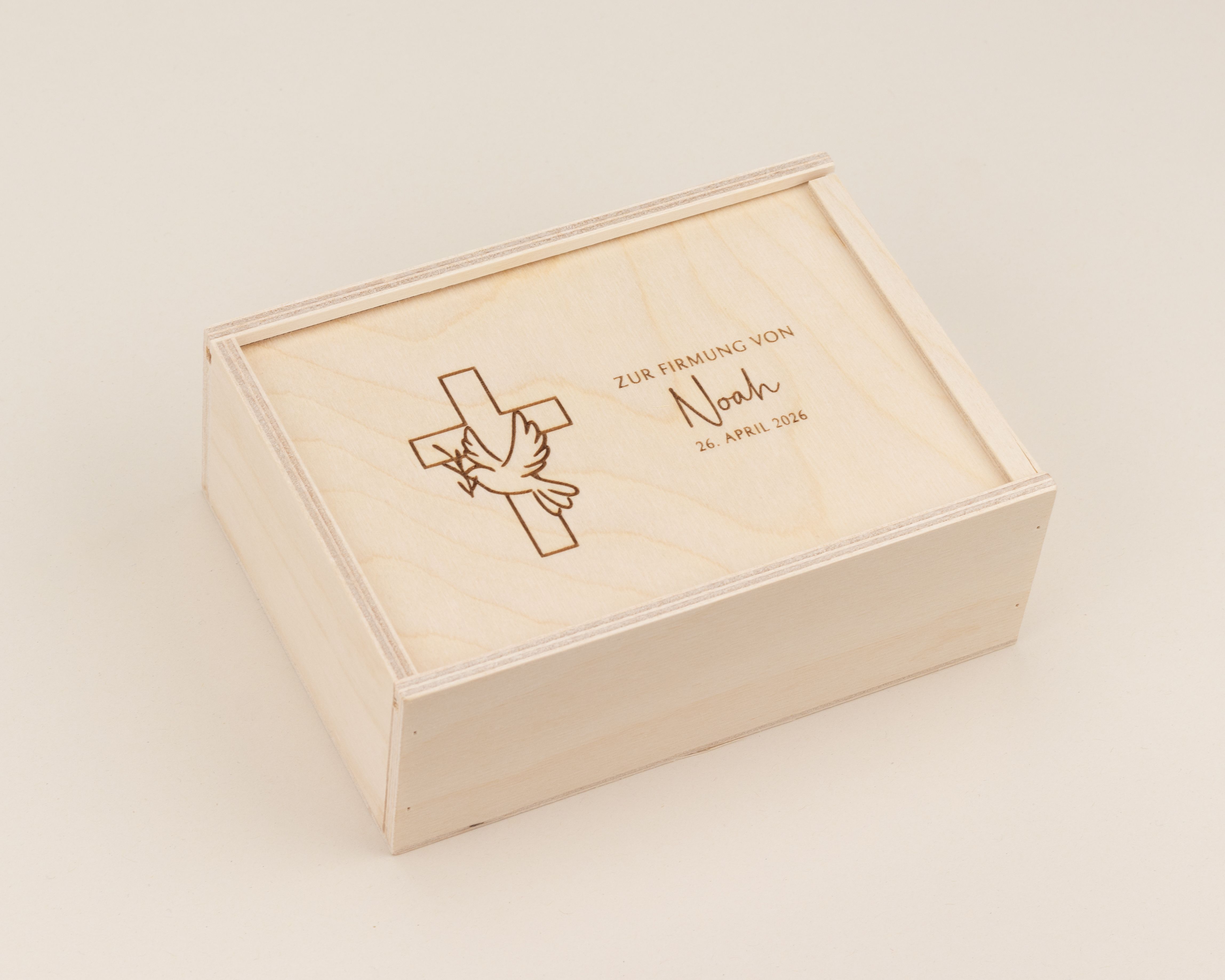 Unsere personalisierte Geschenkbox aus Holz ist dafür die schönste Antwort. Der Schiebedeckel wird mit einem Kreuz und der Taube als Symbol für den Heiligen Geist graviert. Zusammen mit dem Namen des Firmlings wird die Box zu einem ganz persönlichen Schatz, der nach dem großen Tag wertvolle Andenken aufbewahrt.