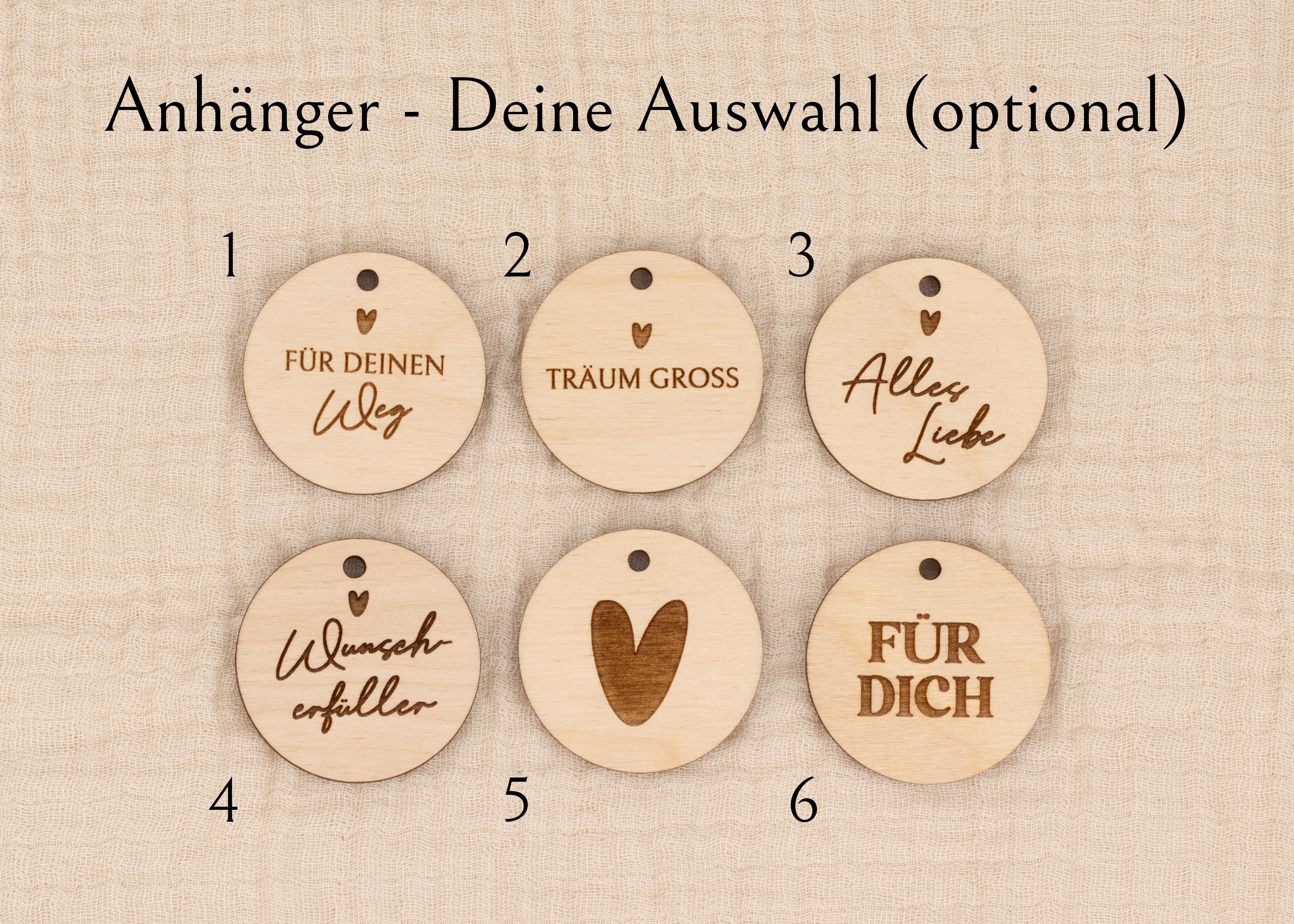 Mach die Box zu einem ganz persönlichen Geschenk: Gib den Namen des Kindes an und wähle einen von vier inspirierenden Sprüchen für die gravierte Holzscheibe. Optional kannst du das Datum der Jugendweihe ergänzen, eine persönliche Widmung auf der Holzscheibe hinzufügen oder das Geschenk mit einem passenden Anhänger samt Kordel abrunden.