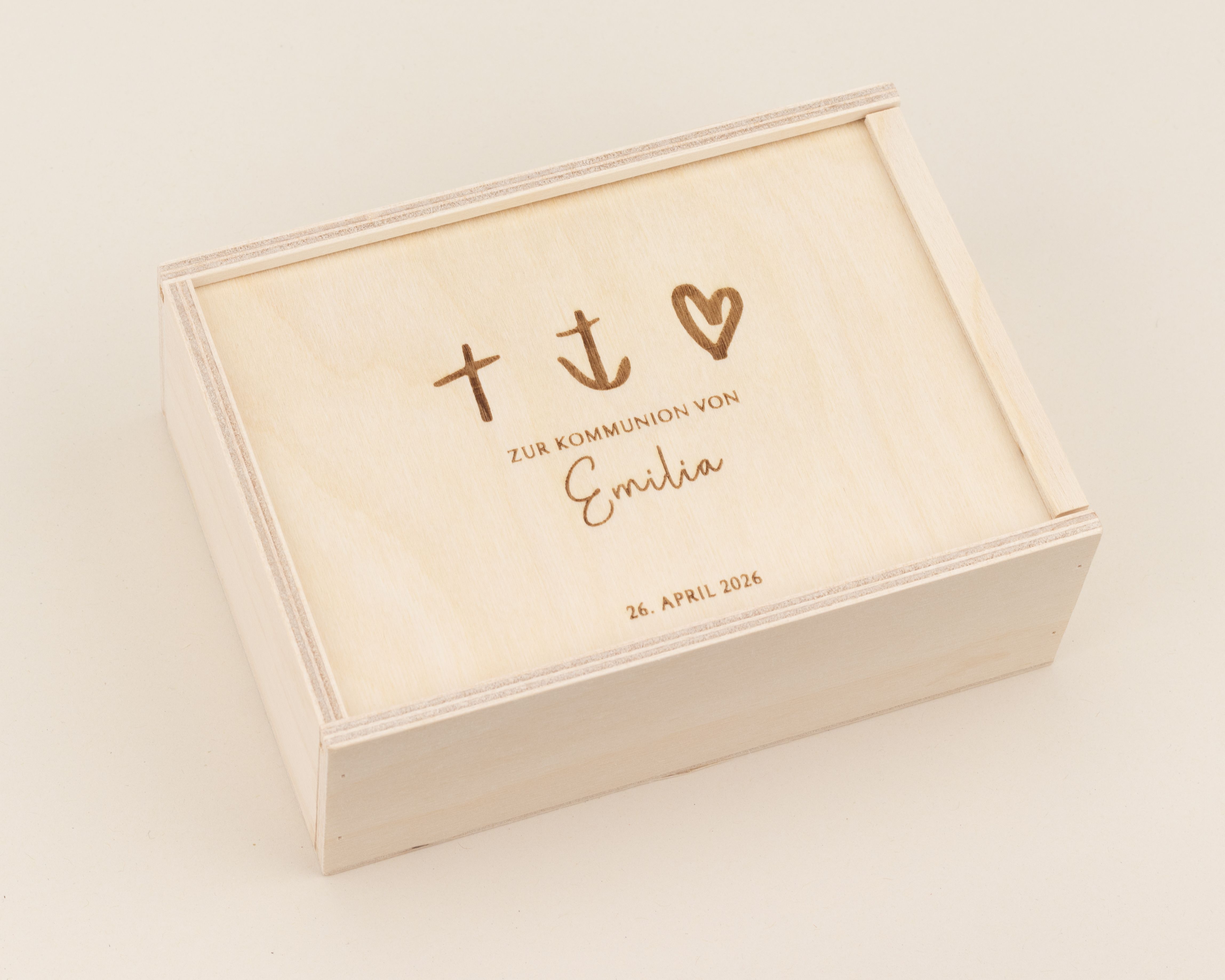 Unsere personalisierte Geschenkbox aus Holz ist die Antwort. Sie verwandelt dein Geldgeschenk in eine wertvolle Botschaft. Der Deckel wird mit den zeitlosen Symbolen für Glaube, Hoffnung und Liebe graviert, zusammen mit dem Namen des Kommunionkindes. So wird aus einer schönen Verpackung eine Schatzkiste für all die kleinen Erinnerungen an die Erstkommunion, wie Glückwunschkarten oder Fotos.